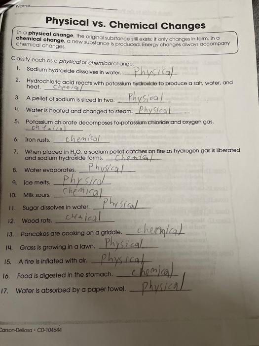 Solved Name Physical Vs Chemical Changes In A Physical Chegg Com
